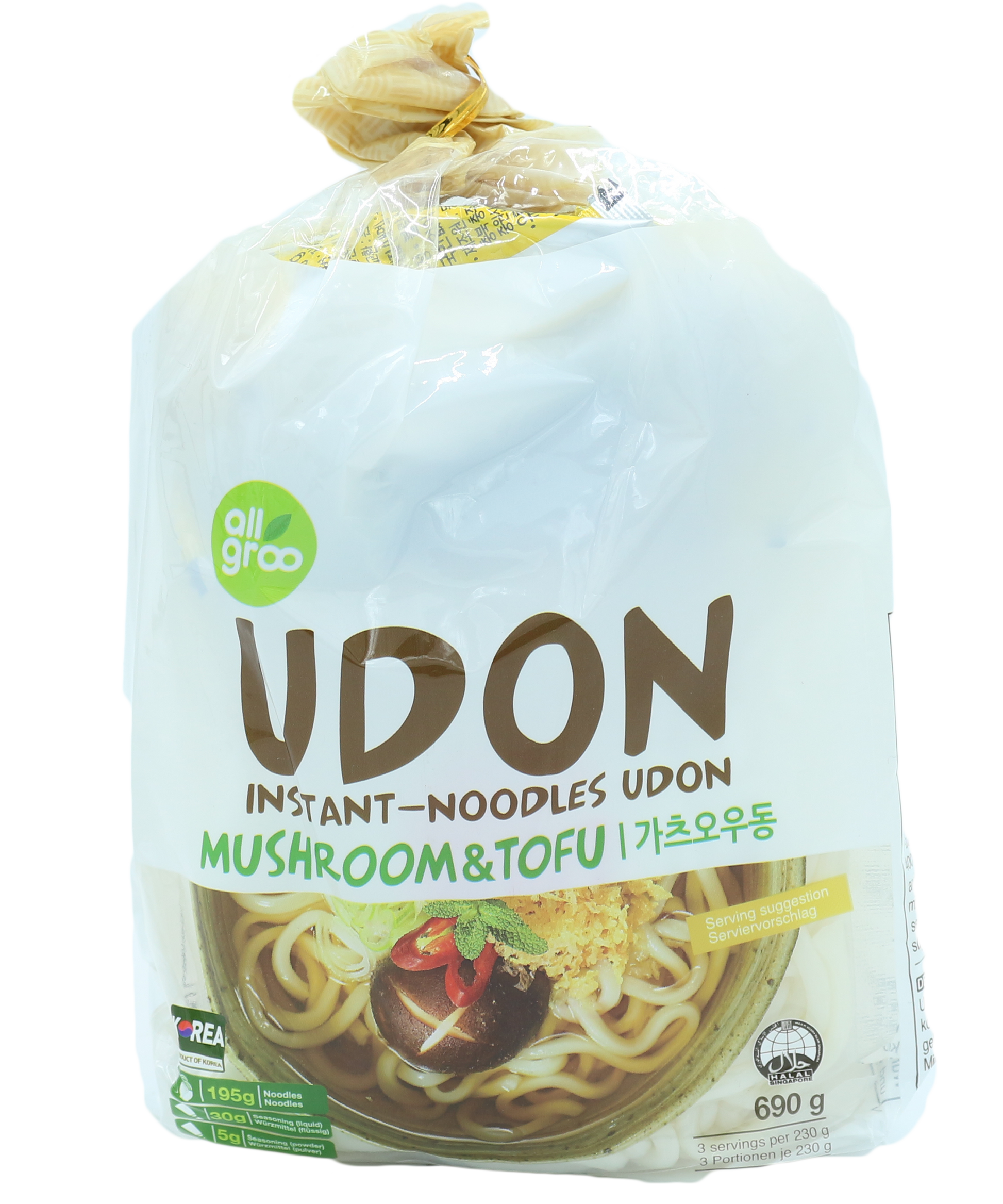 En mild udon-nudelvariant med tofu og svampe smag, perfekt som let og hurtig suppe eller som del af et måltid.