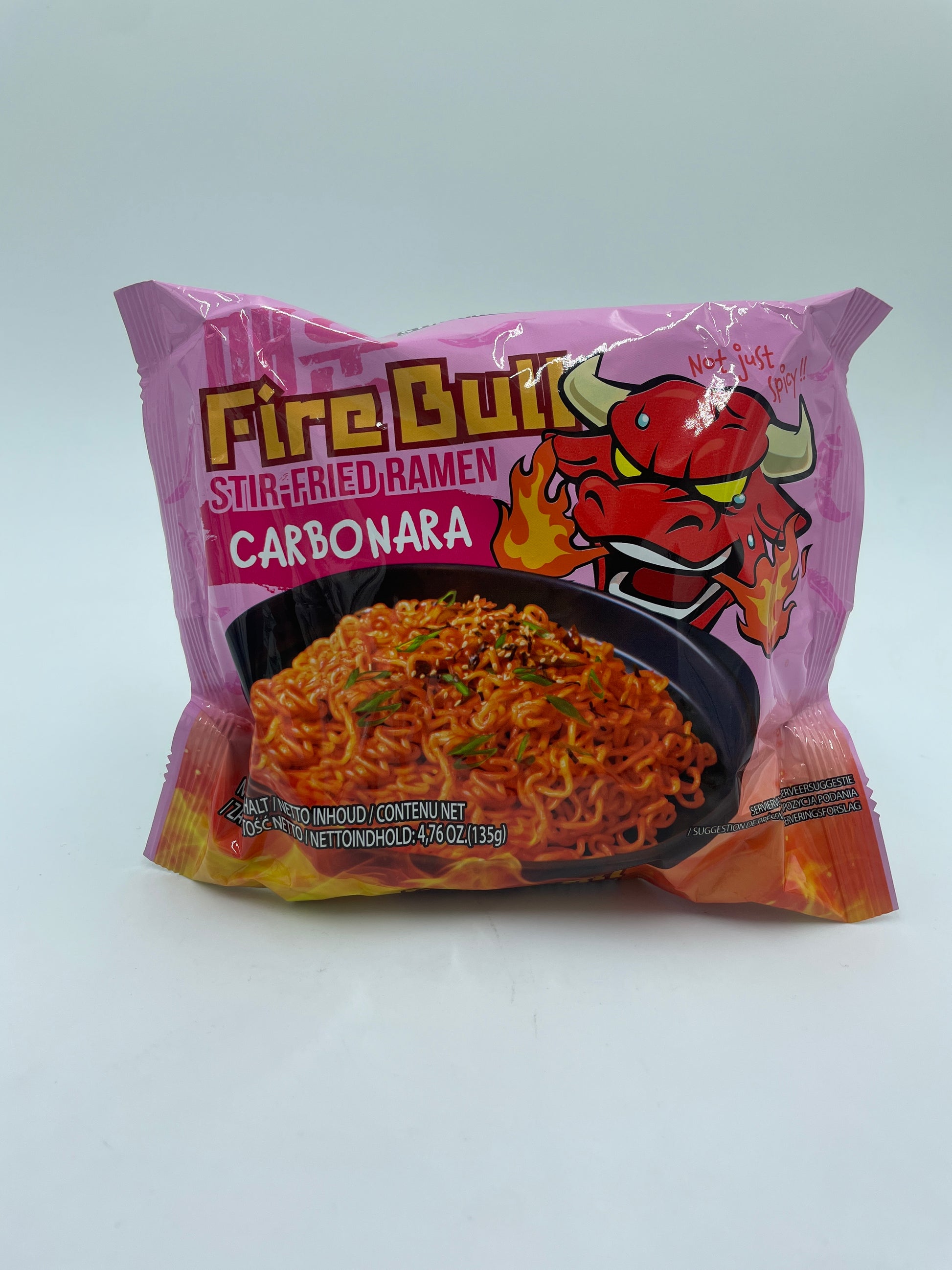 Fire Bull Carbonara er en koreansk-inspireret stir-fried ramen, hvor den klassiske cremede carbonarasmag møder stærk chili. Perfekt til dem, der vil have et fyldigt og krydret måltid uden suppe.